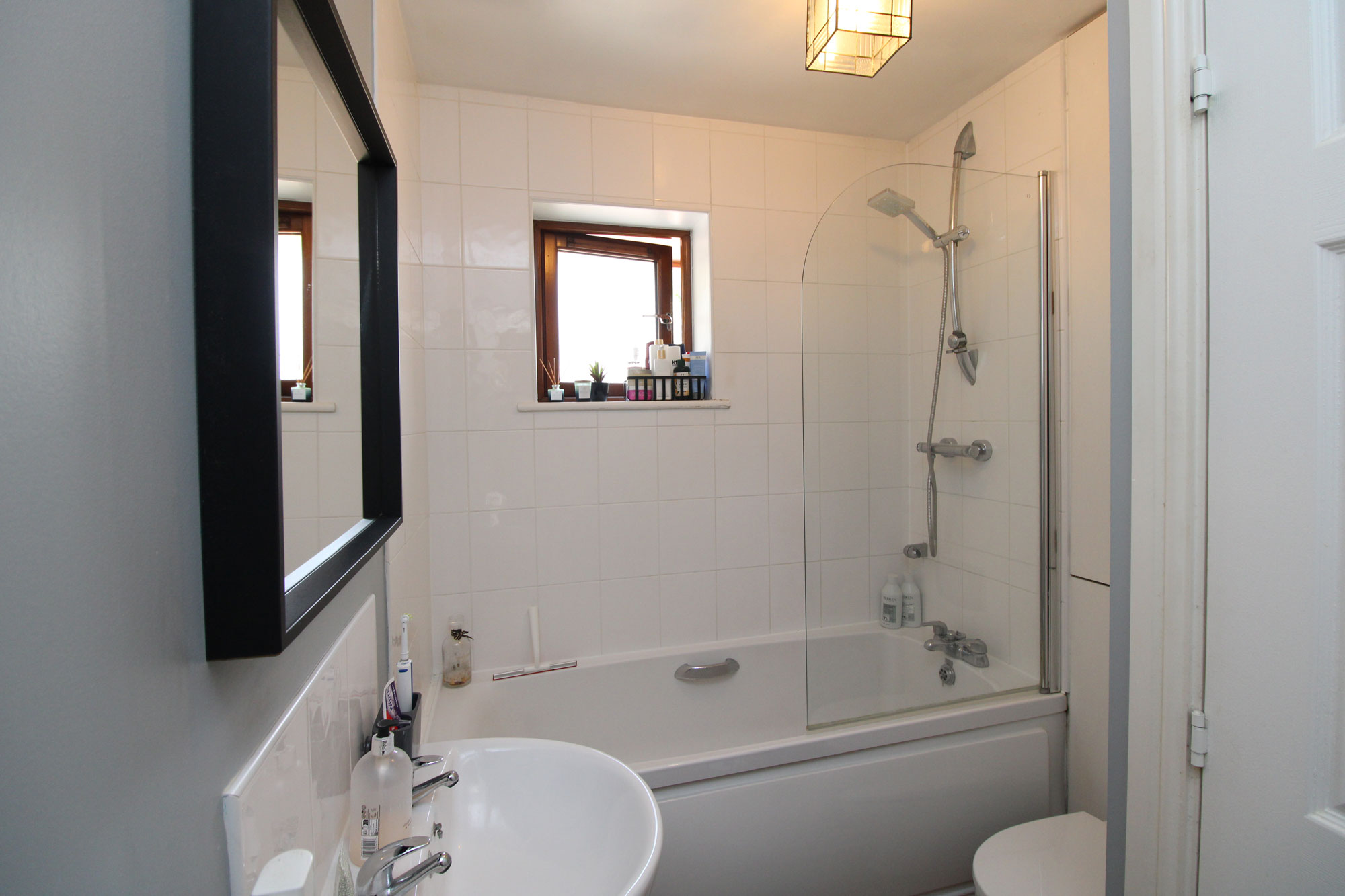BATHROOM Panelled bath with mixer taps and separately controlled shower over the bath, close coupled WC, pedestal wash hand basin, part tiled walls, heated towel rail, extractor fan, double glazed window.