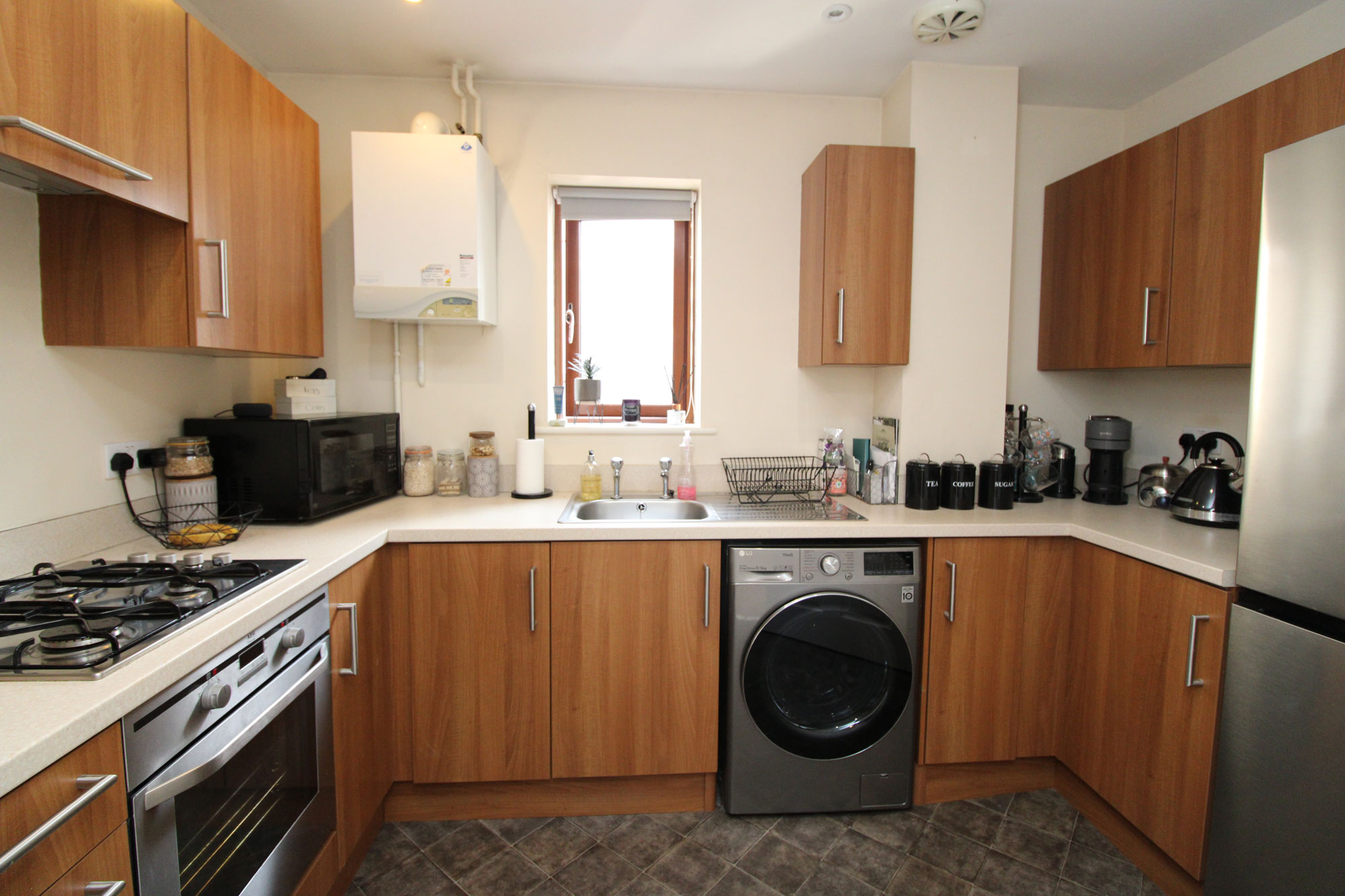 KITCHEN About 10’9” x 7’1” Stainless steel single drainer sink unit set in a rolled work top, cupboards and drawers under, matching wall cupboards, inset gas hob with extractor over, built-in electric oven, space fridge/ freezer, plumbing for washing machine, wall mounted gas boiler for central heating and domestic hot water, power points, double glazed window.