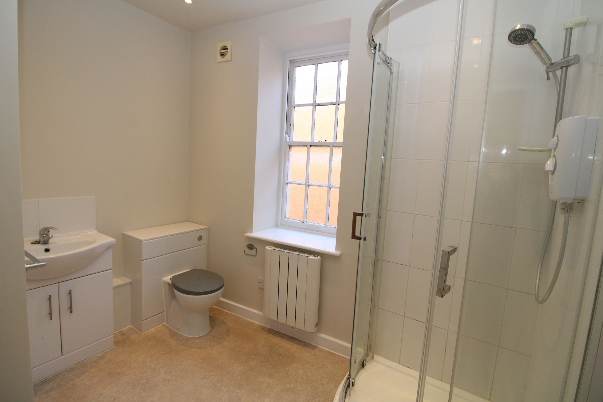 SHOWER ROOM Fully tiled shower cubicle with thermostatic shower unit, WC with concealed cistern, wash hand basin with mono mixer tap and cupboard under, electric heater.