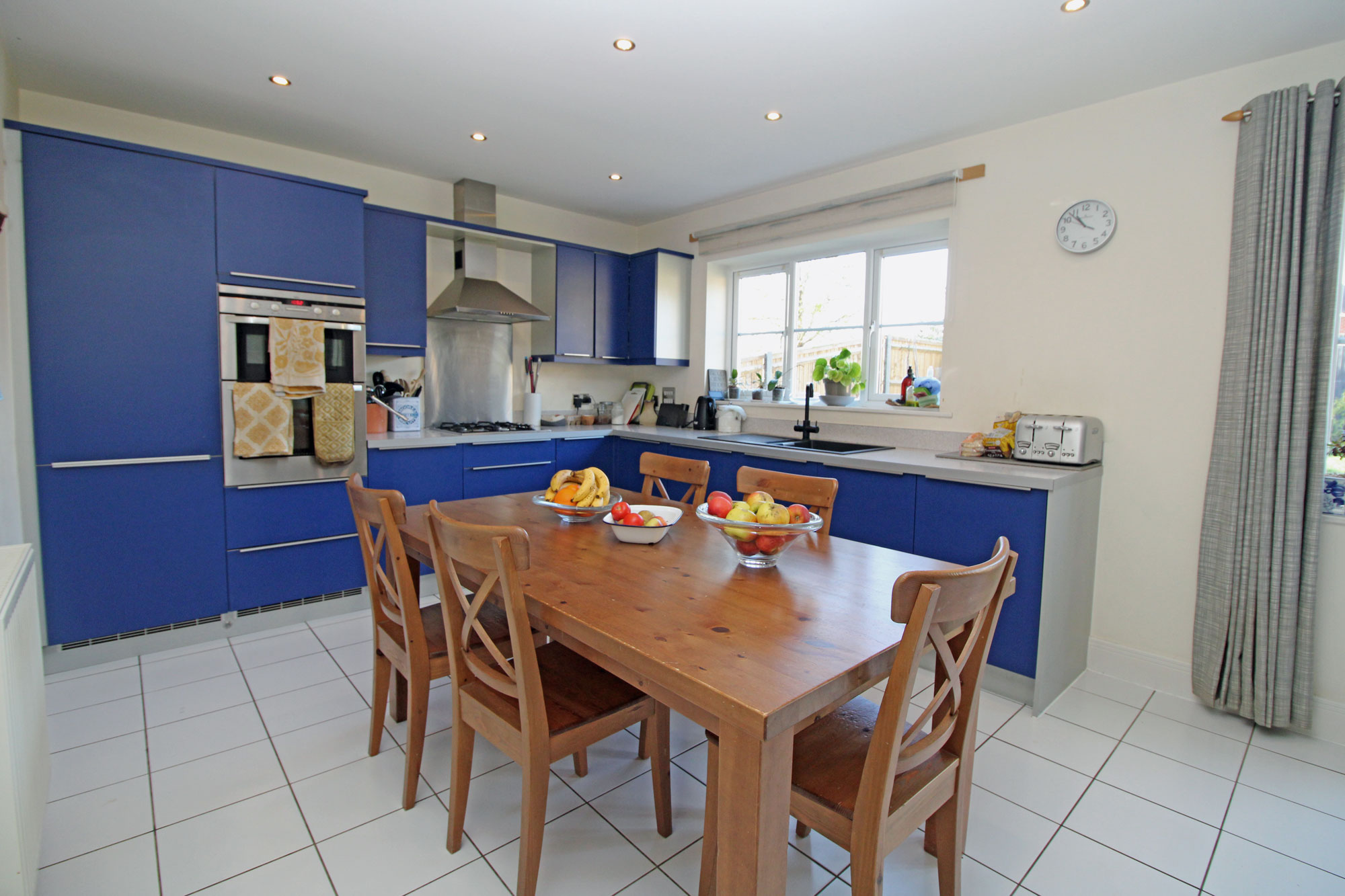 KITCHEN DINING ROOM About 23’x 11’6” One and half bowl sink with mixer taps set in a square edge work surface, cupboards and drawers under, matching wall cupboards, built in double eye level oven, and hob with extractor over, integrated fridge freezer and dish washer, two radiators, power points, television point, ethernet/network point, ceiling with down lighting, ceramic tiled floor, double glazed window, double glazed casement doors to the rear garden.