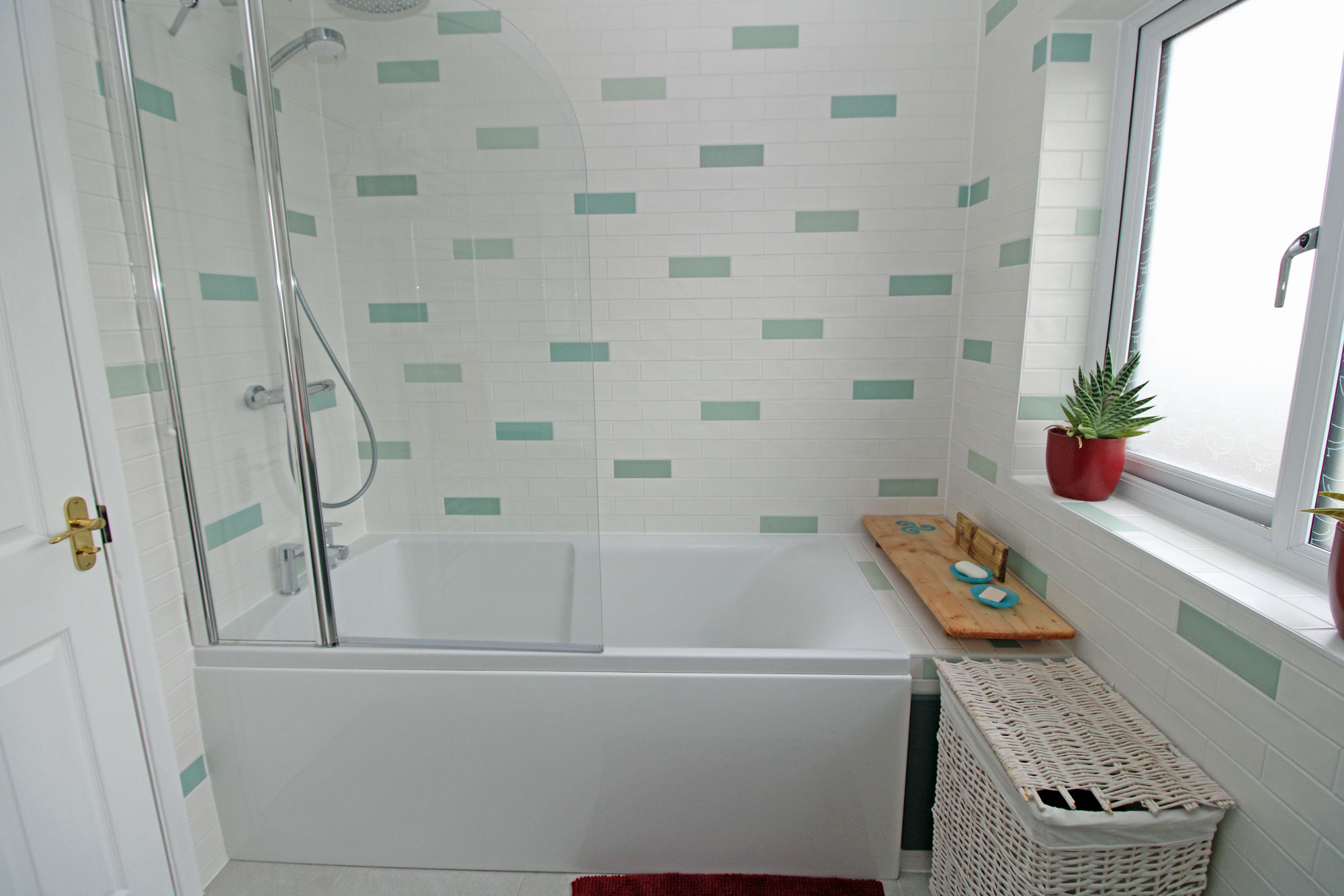 BATHROOM Fully tiled, extra-wide panelled bath with shower over, glass shower screen, built-in vanity unit white worktop incorporating an inset wash hand basin with cupboards under and a WC with concealed cistern, chrome heated towel rail, double glazed window, extractor fan, ceramic tiled floor.