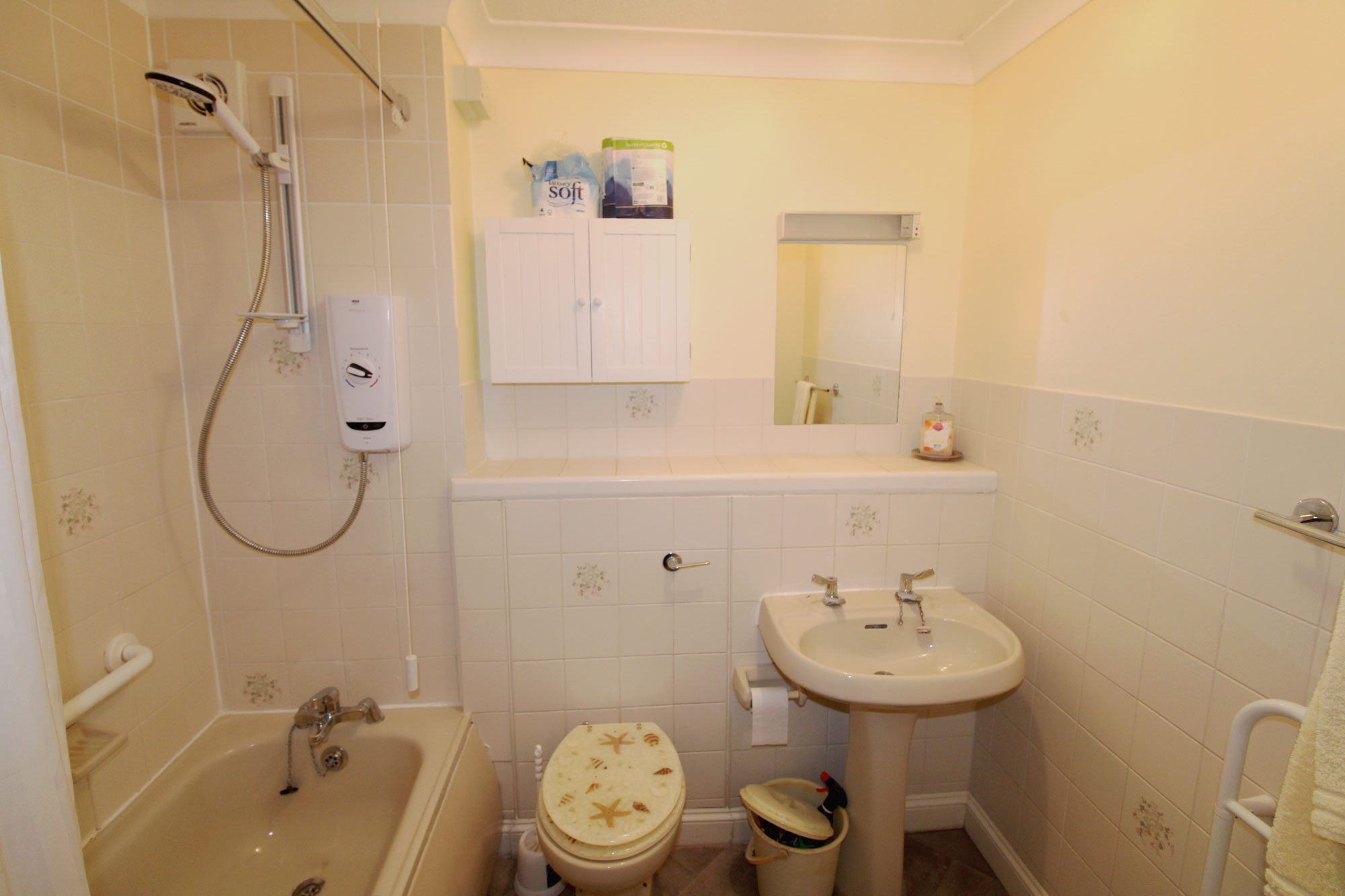 BATHROOM Panelled enclosed bath with Mira shower unit, close coupled WC, wash hand basin, part tiled walls, heated towel rail, extractor fan.