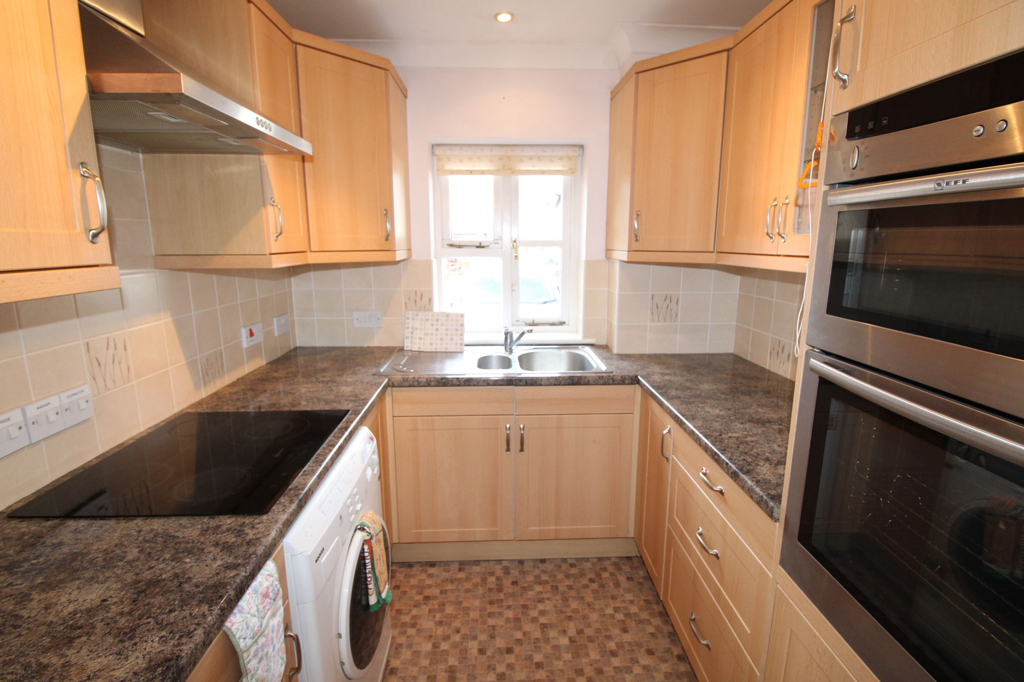 KITCHEN About 7’x 7’ One and a half bowl single drainer sink unit with cupboards under, a further range of matching eye level and base level units with rolled edge work surfaces, inset ceramic hob unit, built in electric oven, built-in fridge, part tiled walls, plumbing for washing machine, thermal double glazed window.
